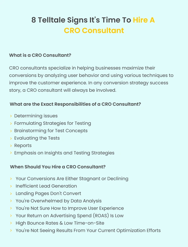 There are early signs that indicate it’s time to hire a CRO consultant. Your conversion rate optimization deserves a professional eye if you encounter any of these scenarios: