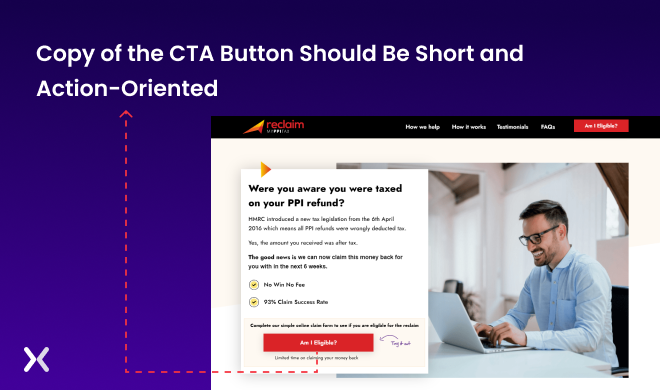 For example, A UK based company has utilised a call to action button text that complements the headline. Most visitors will be curious about their eligibility criteria. Making a test surrounding it and a CTA to point towards it helps prospects who want to learn more.