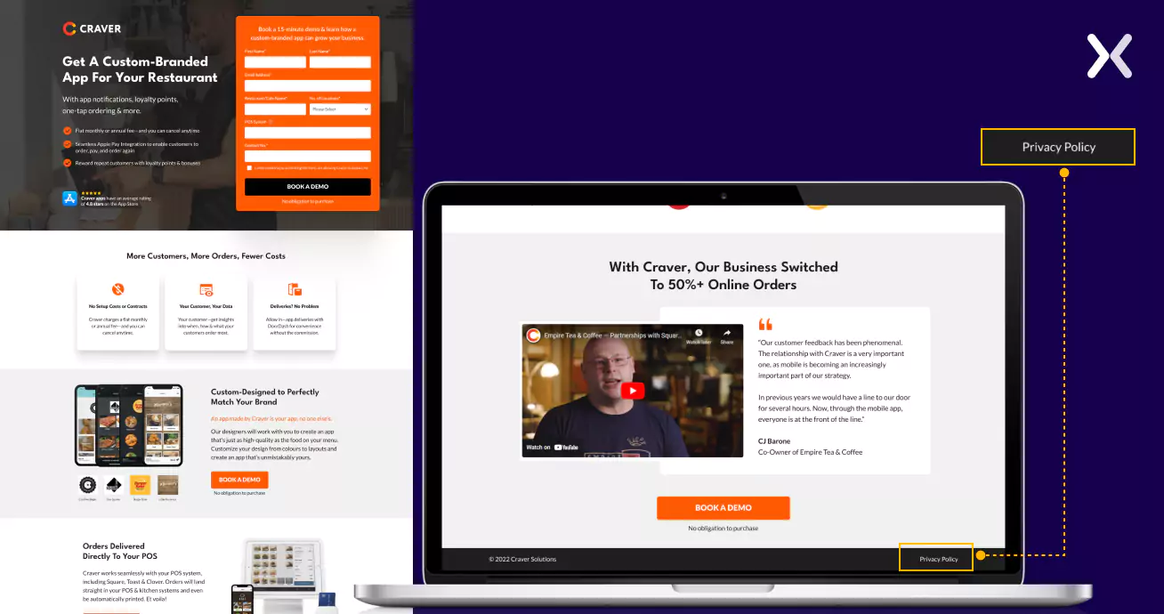 For example, below is a landing page example that shares its privacy policy at the footer, one of the best places to put it.