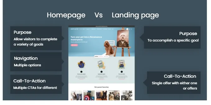 What is the difference between a landing page and a homepage? A simple business ideology settles the landing page vs homepage argument: intention. These two serve different purposes, each tailored to achieve specific business goals.