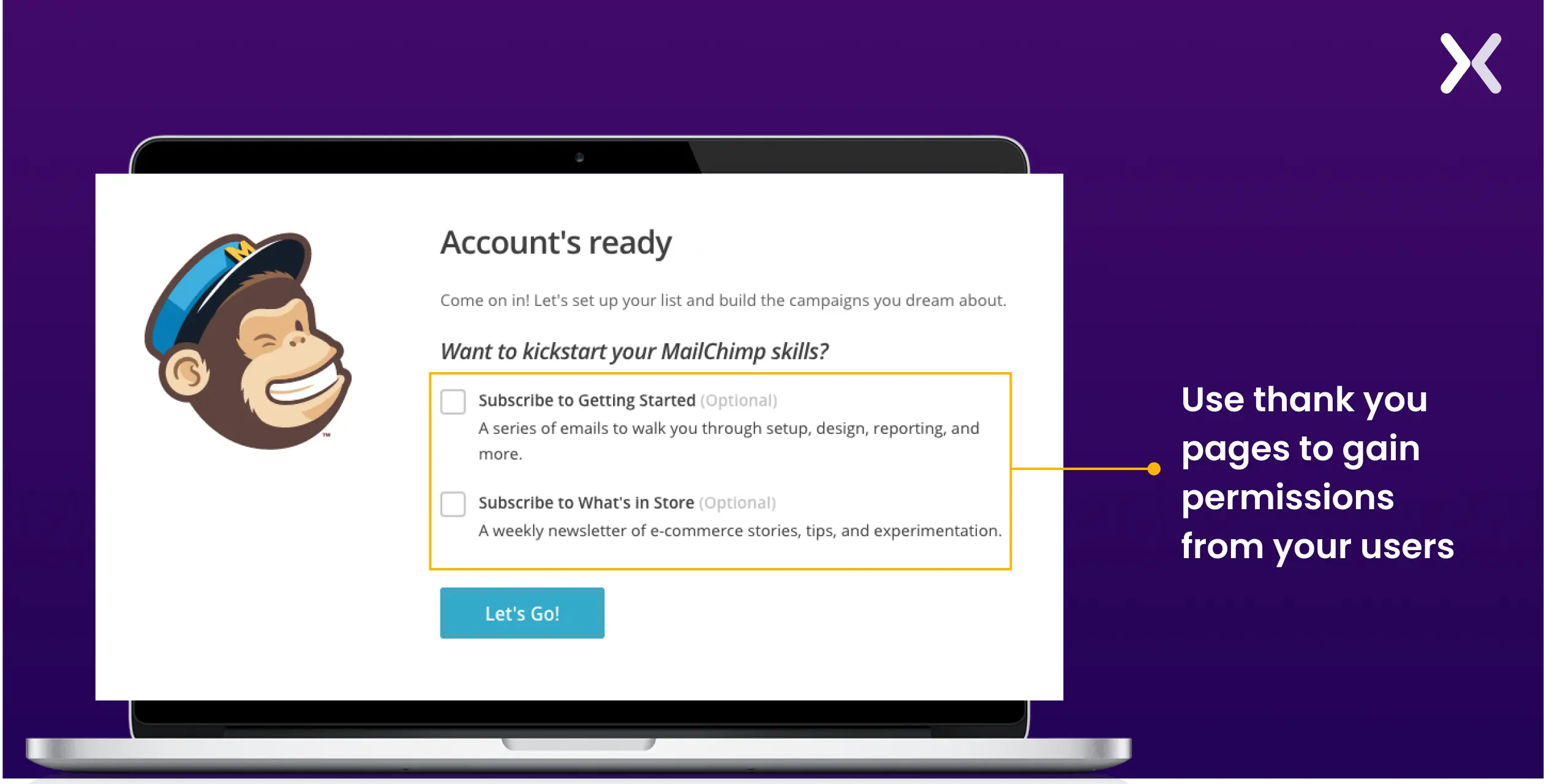 The thank you page offers an opportunity to gain this permission and learn more about user preferences.